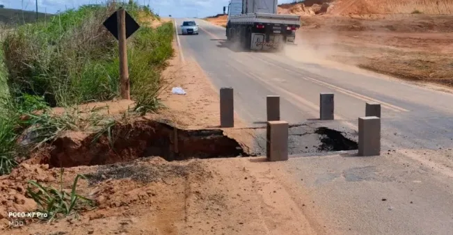 Motoristas que trafegam pela BA-290, especialmente no trecho entre Teixeira de Freitas e Medeiros Neto, precisam redobrar a atenção ao se aproximarem do trevo de acesso à cidade de Medeiros Neto. Após as fortes chuvas dos últimos dias, uma grande cratera se formou na pista, provocando a interdição parcial da via e colocando em risco quem passa pelo local.