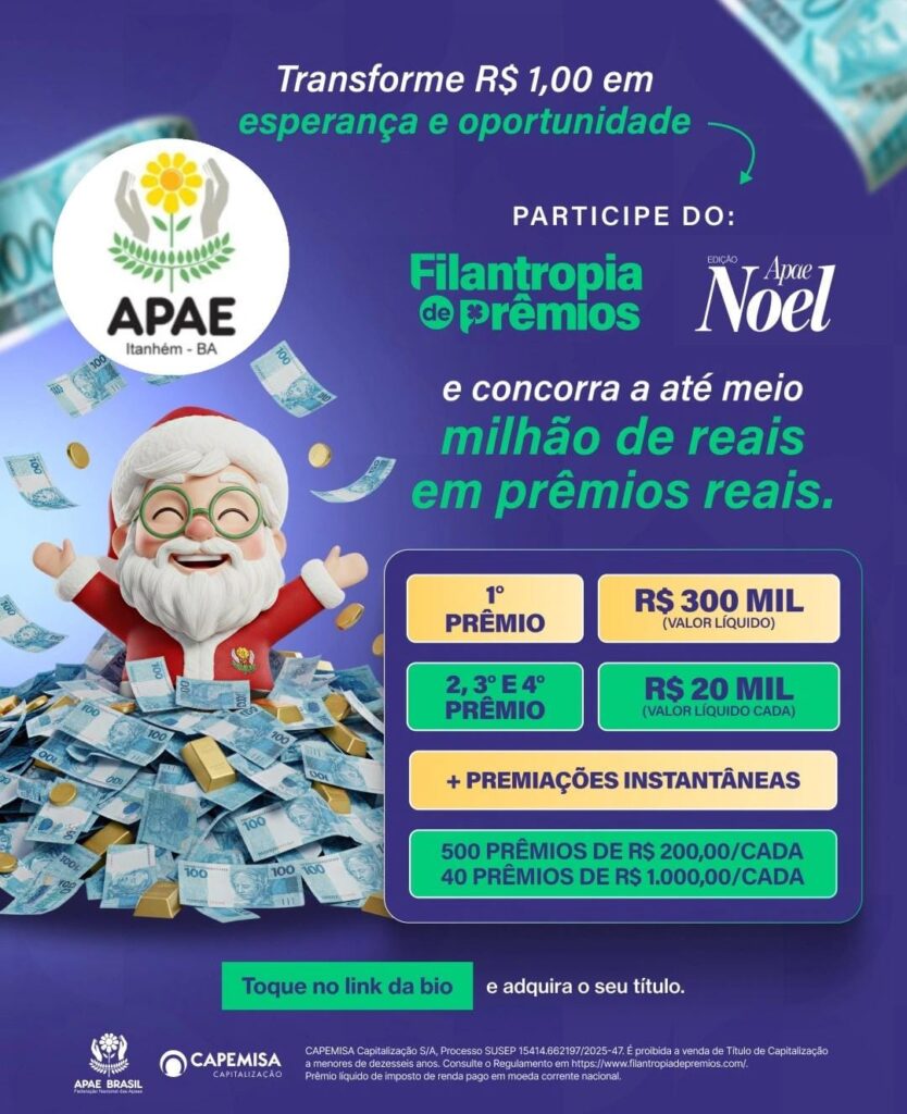 A APAE de Itanhém está promovendo uma grande corrente de solidariedade com o lançamento da campanha Filantropia de Prêmios – Edição Apae Noel, uma iniciativa que une esperança, oportunidade e compromisso social. A ação nasce do desejo de transformar vidas e fortalecer ainda mais o trabalho essencial desenvolvido pela instituição em prol das pessoas com deficiência intelectual e múltipla.